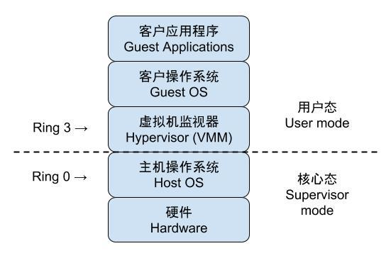 每一个操作系统都有一个内核 kernel ,而这个 kernel 是需要对 CPU 的 ring0 进行操作的。如果没有任何限制,运行多台虚拟机则会出现多个操作系统同时抢占 CPU。所以运行多台虚拟机就需要一个调度程序去进行调度,它被称为 hypervisor (虚拟机控制软件)。通过这样处理以后,我们就得到了虚拟机,而虚机运行在 ring3 环。反过来说。在 ring3 称为用户模式下的 全虚拟化 虚拟机。